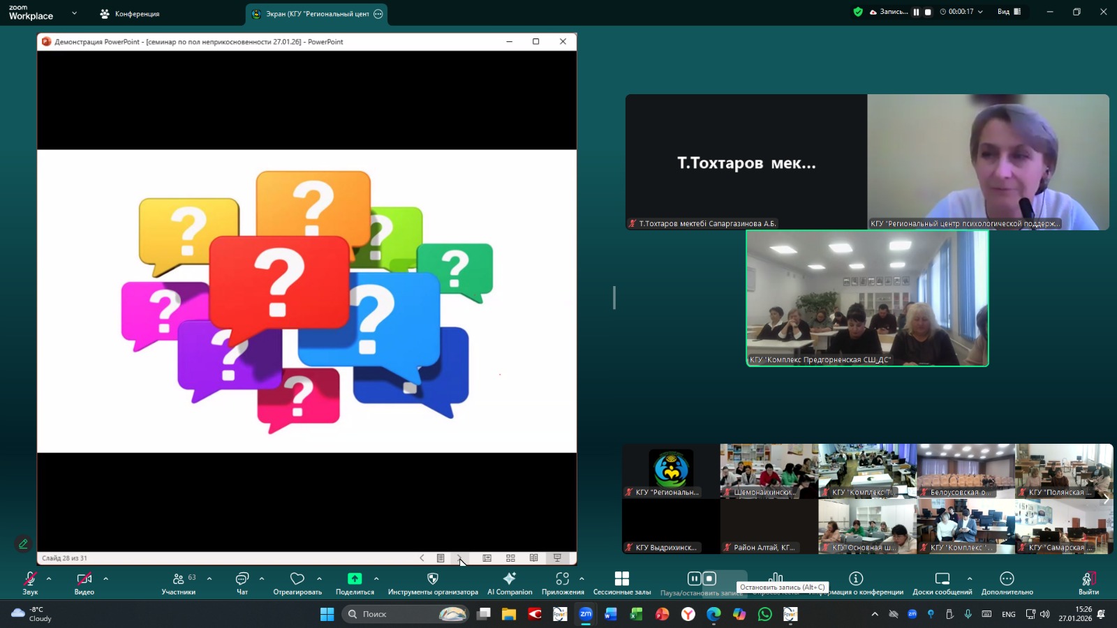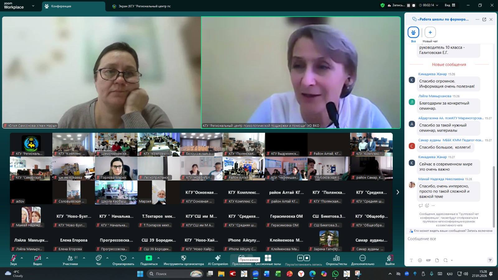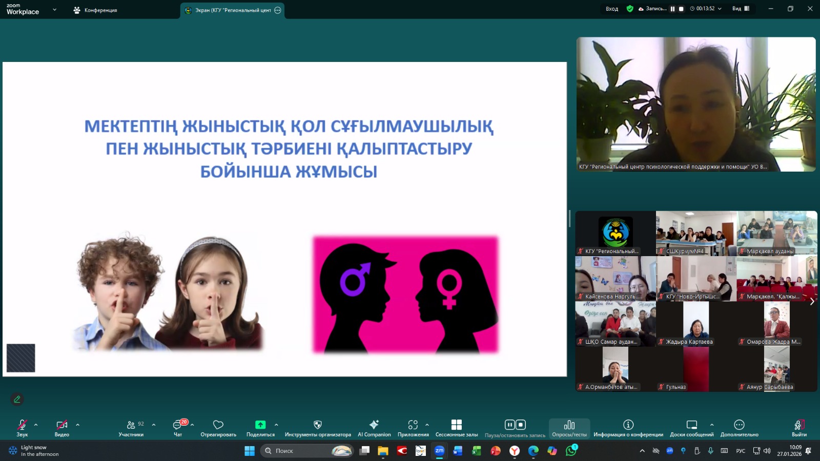 2026 жылдың 27 қаңтар айында Өңірлік психологиялық қолдау орталығының мамандары әдіскер, педагог-психолог Нурхатова Г.А., әлеуметтік педагог Малонуха А.П «Мектептің жыныстық қол сұғылмаушылық пен жыныстық тәрбиені қалыптастыру бойынша жұмысы» тақырыбында семинар жүргізді. Семинарға қазақ тілінде 162 адам, орыс тірінде 181 адам қатысты. Қатысушылар тақырыптың өзектілігі жайлы сөз қозғап, өз пікірлерімен, тәжіриберерімен бөлісті.