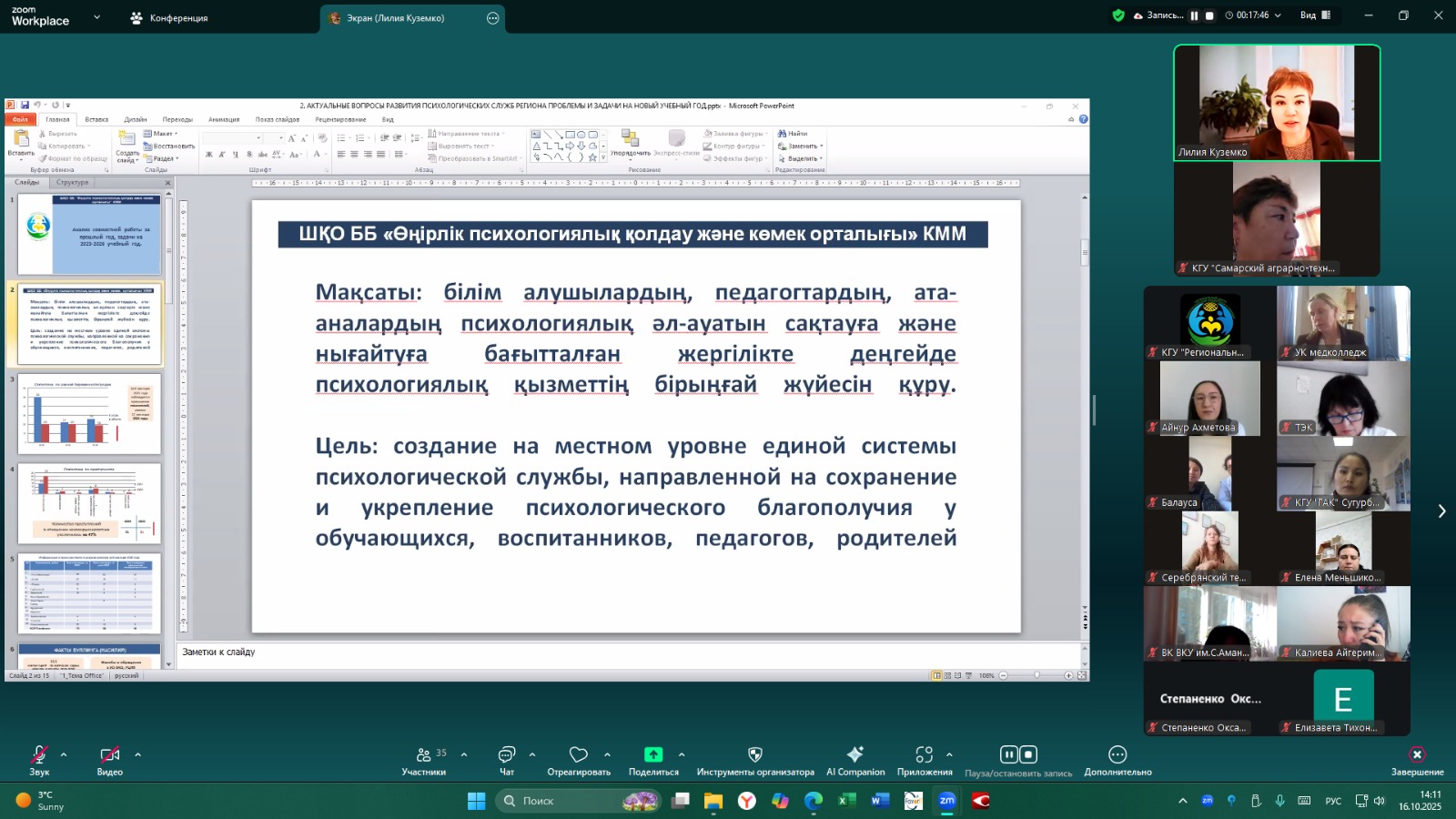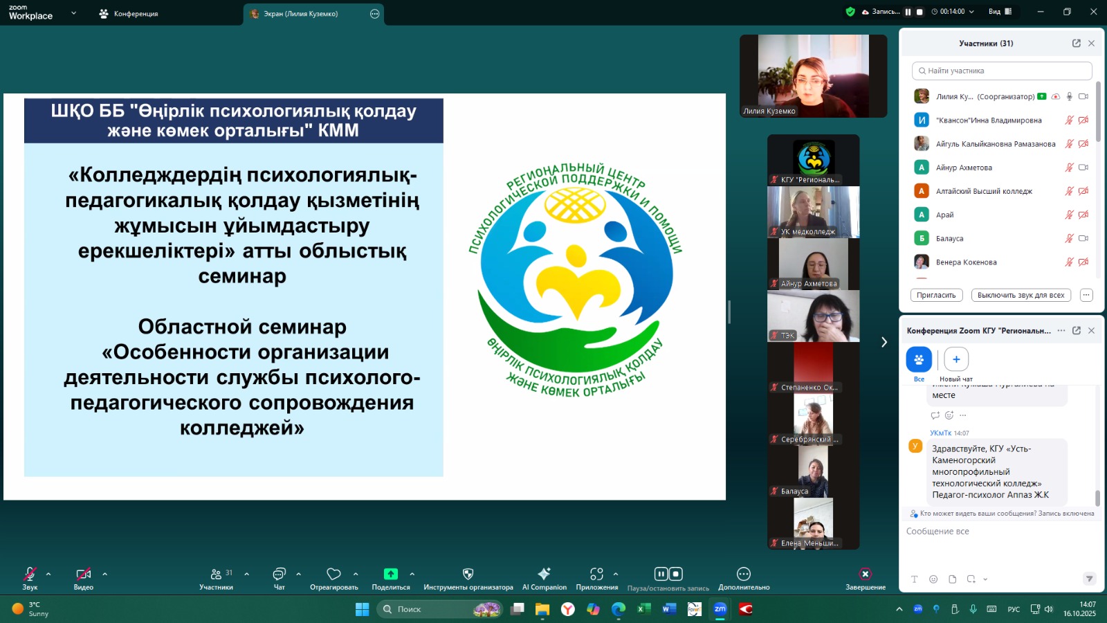 16 октября 2025 года для педагогов-психологов организаций технического и профессионального образования области был проведен онлайн-семинар «Особенности организации деятельности службы психолого-педагогического сопровождения колледжей», в ходе которого были рассмотрены актуальные вопросы функционирования служб психолого-педагогического сопровождения, а также особенности реализации антибуллинговой программы «ДосболLike» и внедрения ИС «Komek Stop Bulling».