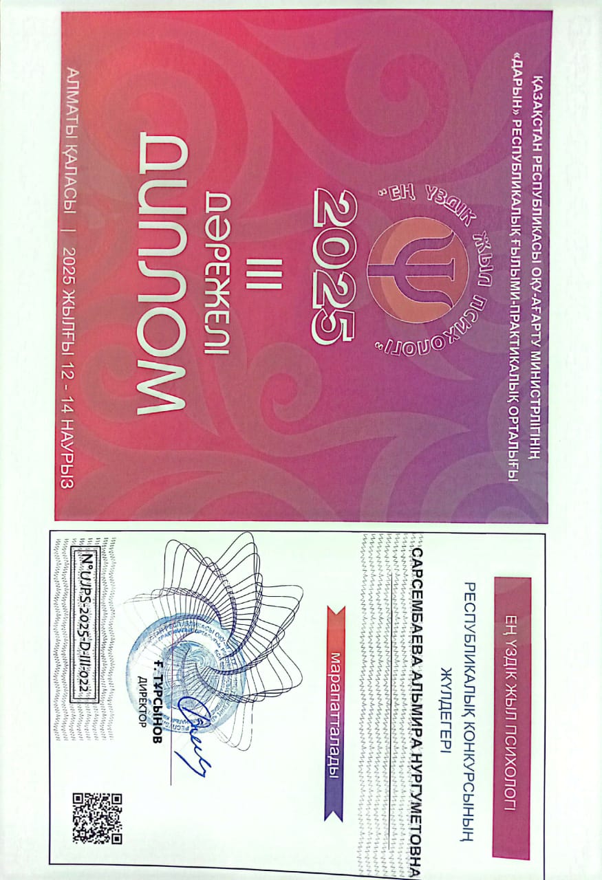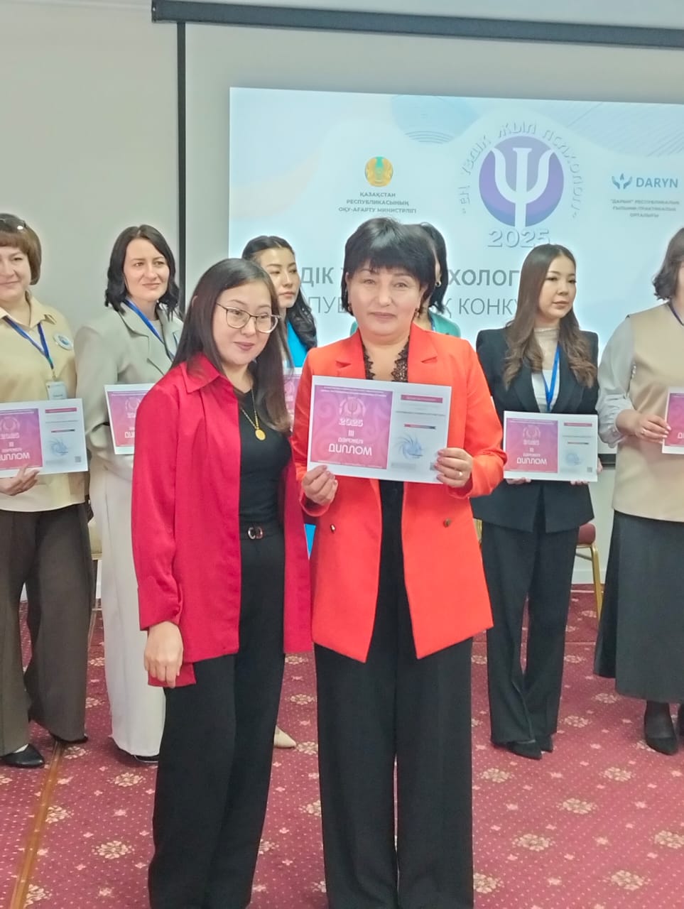 Педагог-психолог КГУ «Средняя школа имени Абдикерима села Шынгыстай» отдела образования Катон-Карагайского района Сарсембаева Альмира Нургуметовна заняла III место в республиканском этапе конкурса «Лучший психолог года – 2025», который проводился в городе Алматы в период с 12 по 14 марта.