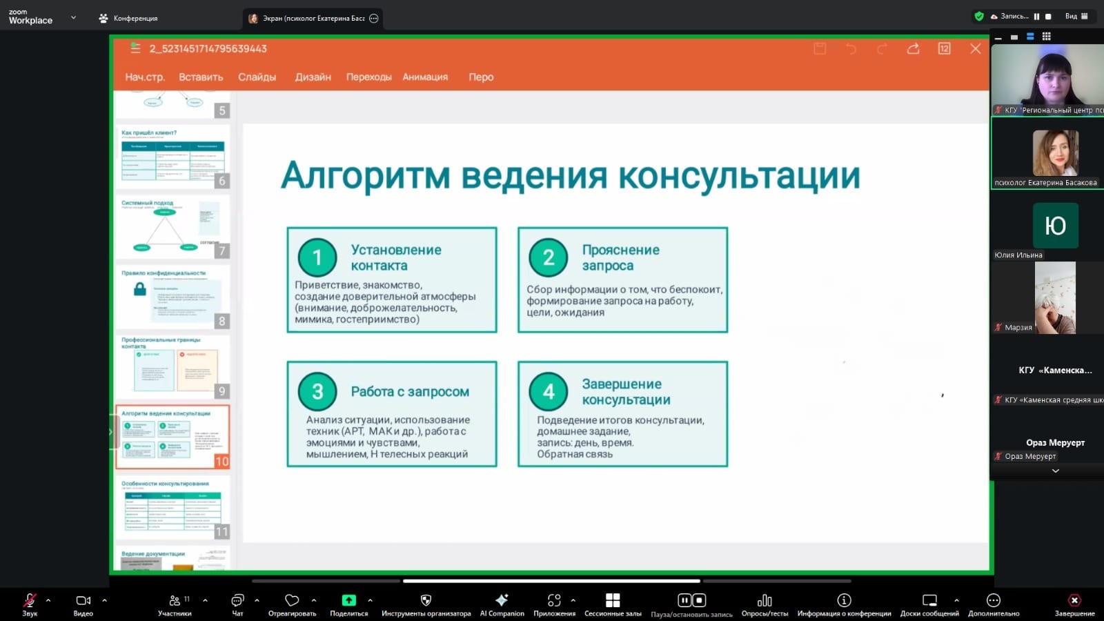 В ходе занятия были рассмотрены ключевые вопросы профессиональной деятельности педагога-психолога в образовательной организации: профессиональная позиция специалиста и опыт консультирования, категории клиентов в школе и специфика их запросов, организация консультативного процесса и взаимодействие со всеми участниками учебно-воспитательного процесса. Отдельное внимание было уделено формированию мотивации клиента к работе с психологом, реализации системного подхода во взаимодействии «ребёнок – родитель – психолог», соблюдению принципа конфиденциальности и выстраиванию профессиональных границ.