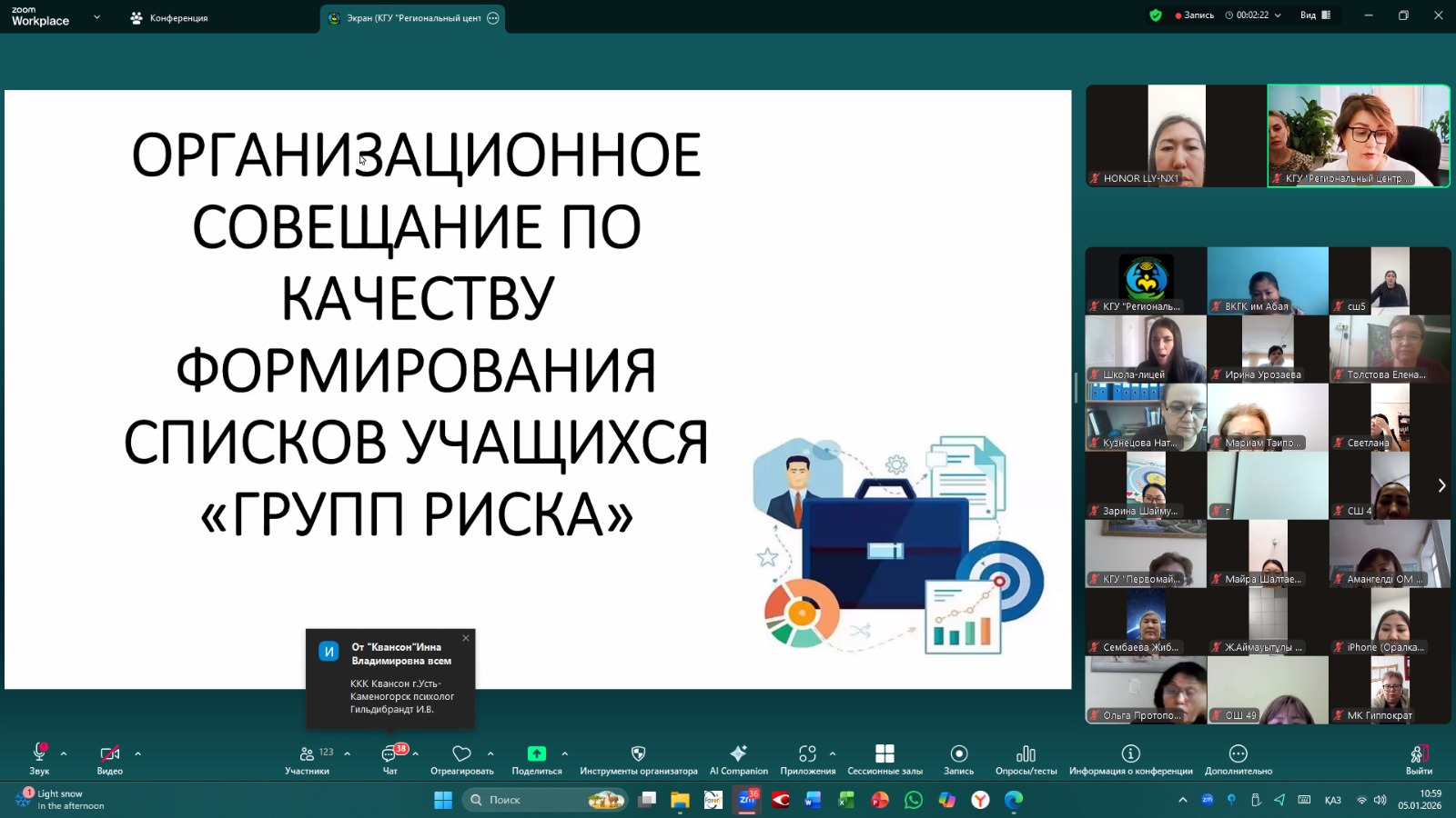 В ходе совещания рассмотрены социальные, психологические и поведенческие риски несовершеннолетних, вопросы раннего выявления и сопровождения детей, нуждающихся в особом внимании, а также актуальные аспекты профилактической и коррекционной работы. Особое внимание уделено необходимости комплексного междисциплинарного подхода, координации деятельности специалистов системы образования и использованию аналитических и статистических данных при планировании мер поддержки. По итогам совещания определены приоритетные направления дальнейшей работы, направленные на повышение эффективности психологической и социальной помощи детям группы риска