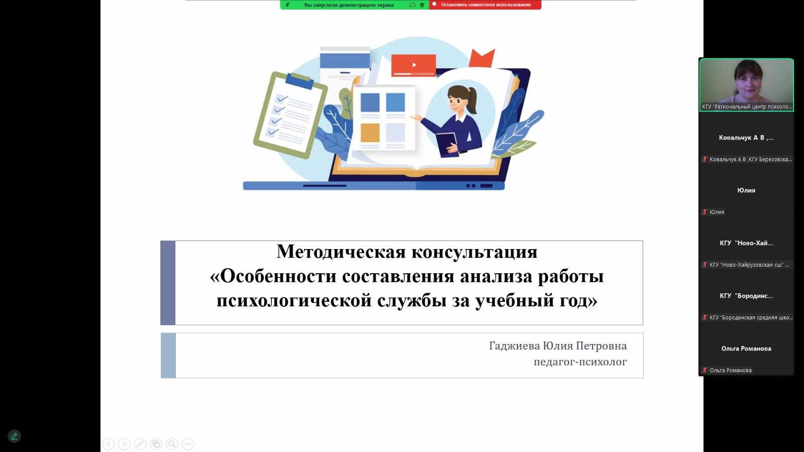 20 мая текущего года состоялось заключительное занятие Школы начинающего психолога для специалистов с опытом работы до двух лет в форме методической консультации на тему «Особенности составления анализа работы психологической службы за учебный год».